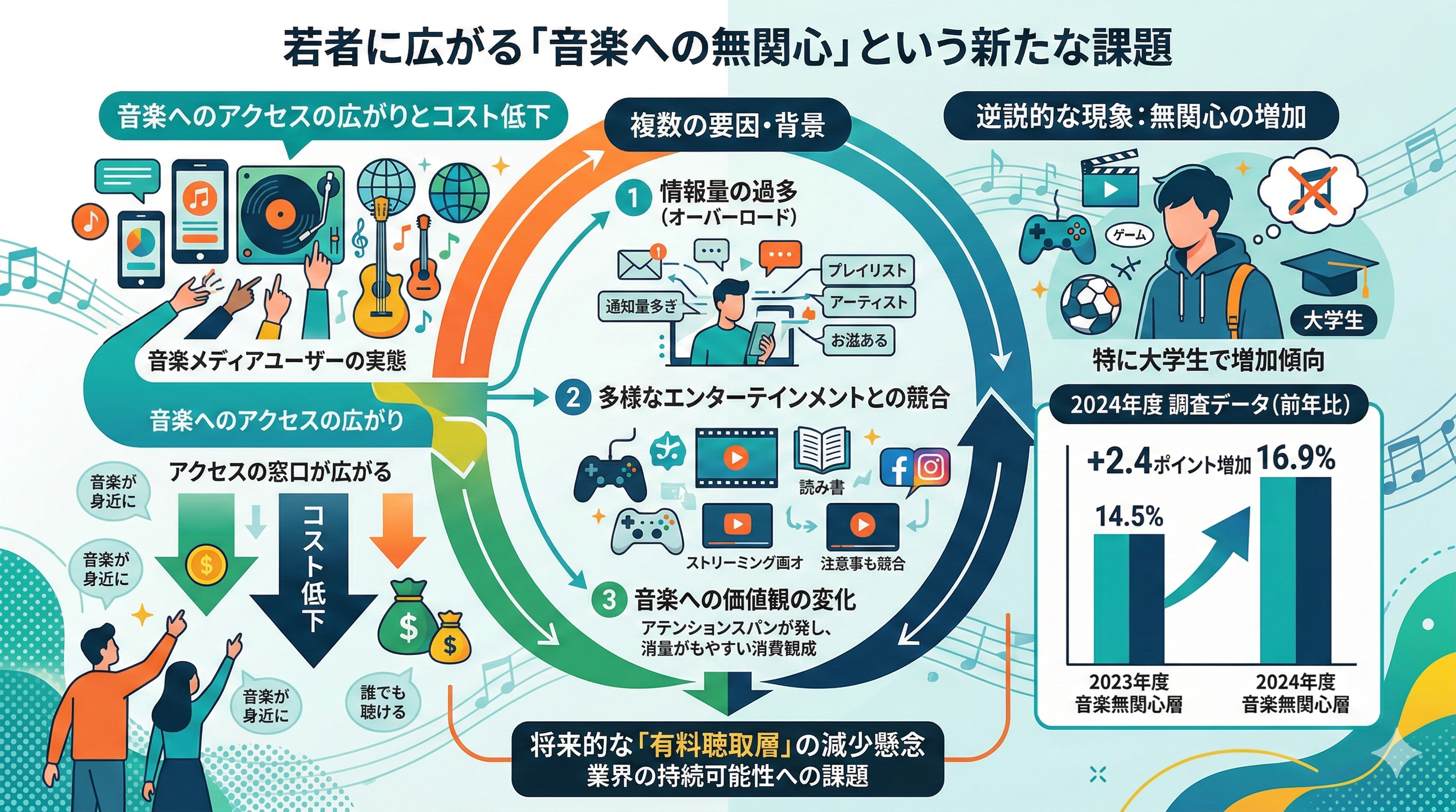 こうした便利さの裏側で、業界が注目する変化がある。2024年度の音楽メディアユーザー実態調査では、音楽に「無関心」と答えた層が前年から2.4ポイント増加していることが示された。特に大学生における無関心層の増加が指摘されており、将来的な有料聴取層の減少に繋がる可能性があると報告書は示唆している。
